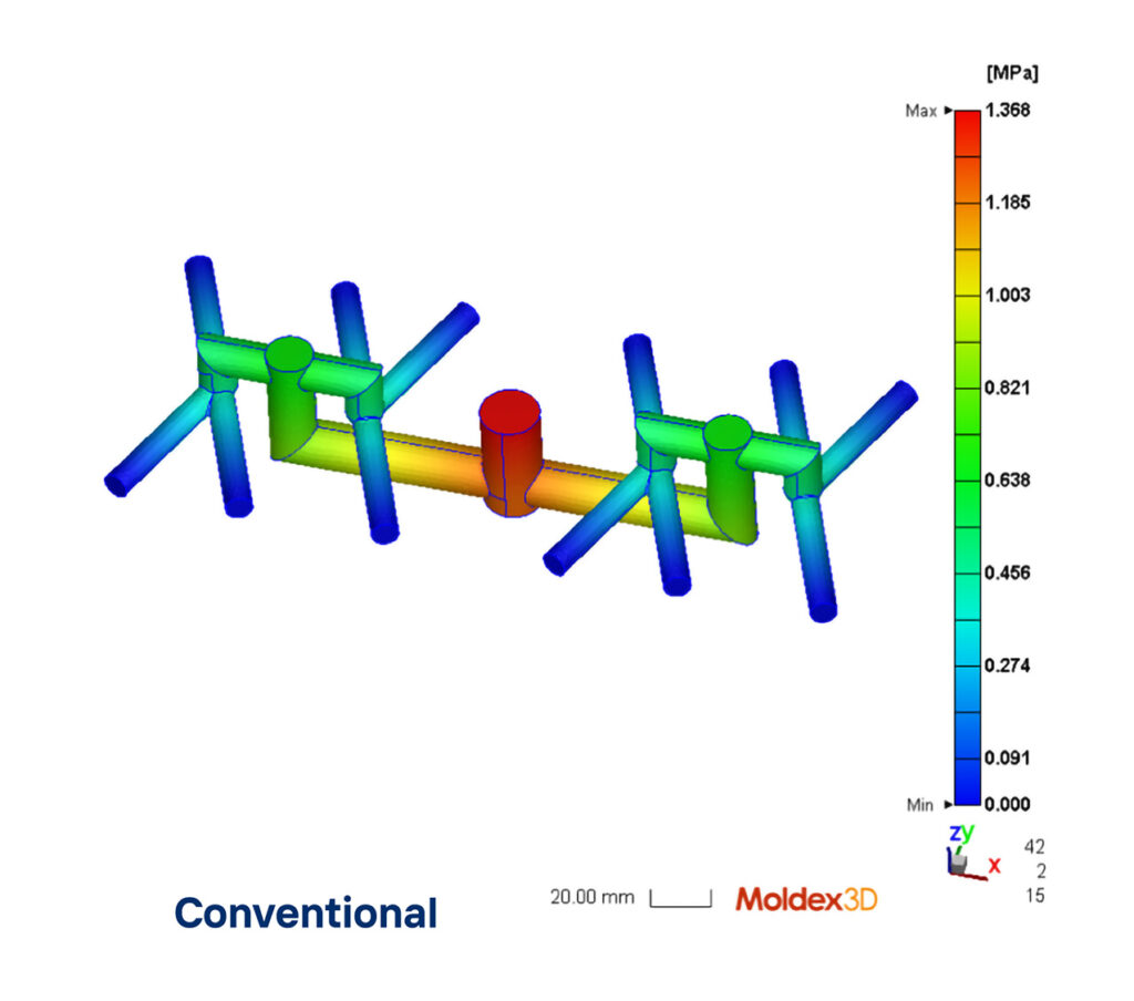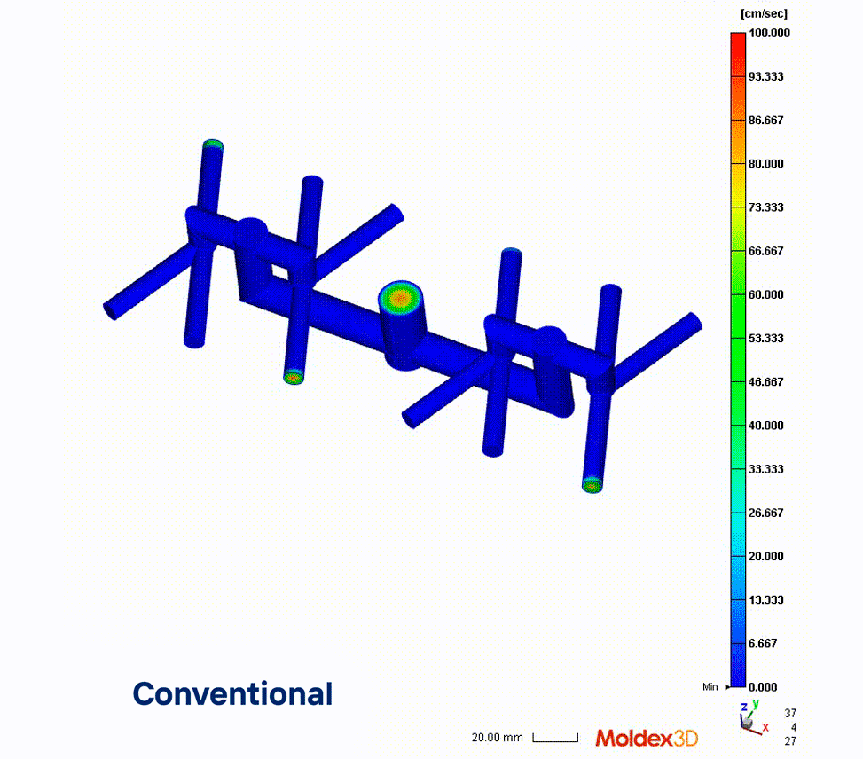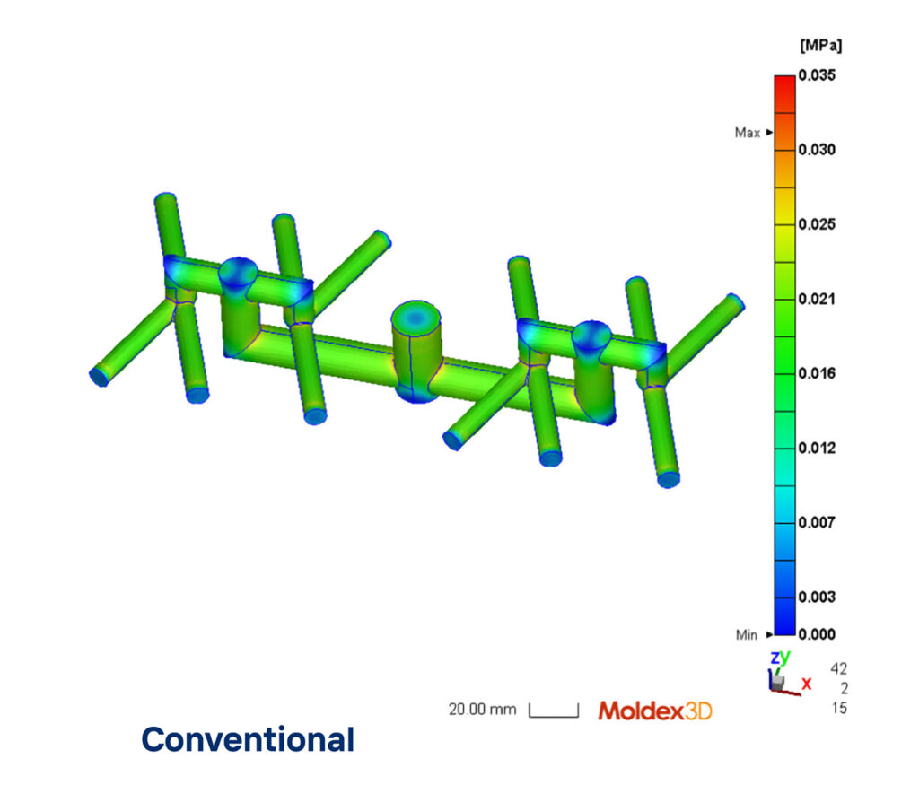 - Pressure drop reduced by 11%, improving flow efficiency in the hot-runner manifold.